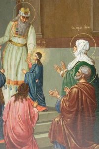 Des textes apocryphes, des enseignements des saints et des révélations des mystiques, nous apprenons que dès l’âge de trois ans, Marie est présentée dans le Temple de Jérusalem pour y être consacrée à Dieu par ses parents, Anne et Joachim. Cette scène se déroule à l’endroit même où d’une part Anne, la mère du prophète Samuel, avait offert son fils pour le service de Dieu et d’autre part là où, des années plus tard, Marie et Joseph se rendront pour accomplir les rites liés la présentation de Jésus. Marie entre au Temple de Jérusalem afin d’offrir à Dieu son âme et sa personne : tel est en substance, le sens théologique de la présentation de Marie.
