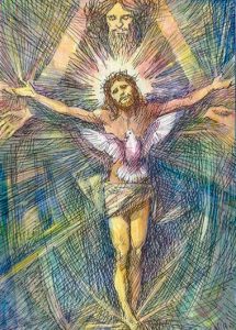 Dieu, le Saint-Esprit : depuis le Sanctus jusqu’à peu après la consécration, le Saint-Esprit devient visible en image, en même temps que Dieu le Père. Il a l’apparence d’un jeune homme d’environ 20 ans, dans une jeunesse éternelle, débordant de force vitale. Cette représentation possède bien une forme humaine, mais non une nature humaine. De tels hommes n’existent pas. Tout est bien plus fin, sublime et spirituel que dans la nature humaine pure. Et pourtant cette forme n’est pas une silhouette vague, comme pourrait en concevoir un artiste. La représentation symbolique est vivante. Elle rayonne d’une lumière divine : elle manifeste la présence de l’Esprit de Dieu. Ce n’est donc pas une simple image comme un dessin. Nos mots ne peuvent la décrire. Tout échoue ici, car nous n’avons aucun point de comparaison dans l’ordre naturel… qui permette de rendre compte de tels traits sublimes et de l’activité divine. Aucune description ne peut exprimer ce qu’est la réalité de l’ordre divin.