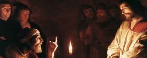 Caïphe, plus agacé que les autres par ce désordre, cherchait une échappatoire. Il s’adressa alors au Seigneur avec insistance, lui demandant, avec adjuration, s’il était le Christ, le Fils de Dieu. Un grand silence tomba. Tous comprenaient la portée de cette question et fixaient intensément Jésus, qui se tenait debout devant eux, les yeux baissés vers la terre.